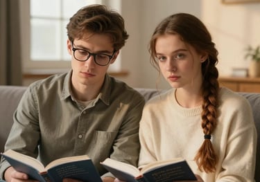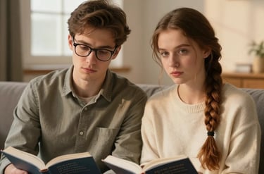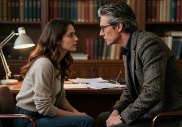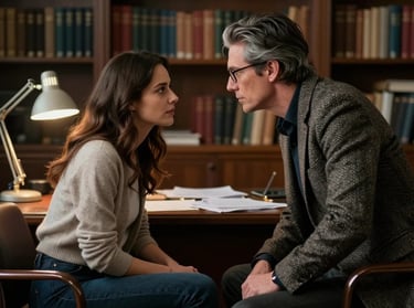 In Professor Gilson’s office, Julia challenges classic literature while subtle glances and fleeting touches hint at a forbidden, simmering connection. Academic debate blurs guarded emotions.