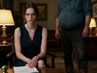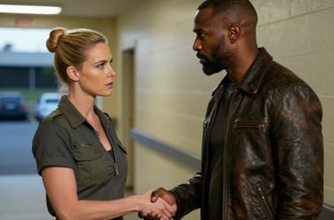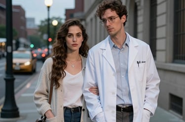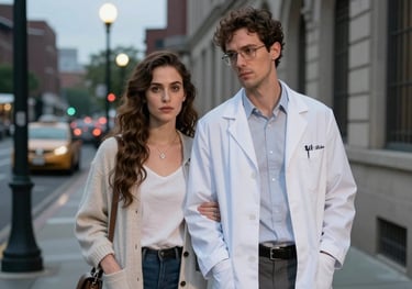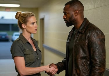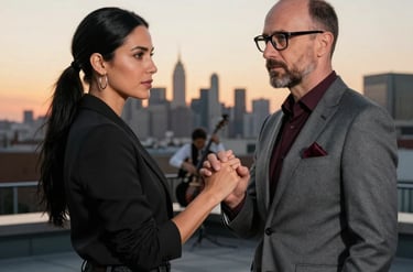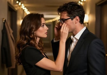Maria and Mark, rival lawyers, share a charged moment outside the courtroom, their professional rivalry tinged with unspoken attraction as they agree to a drink, blurring the lines between competition and desire.
