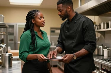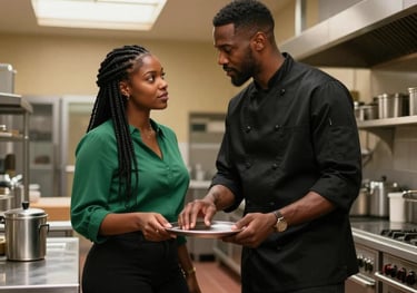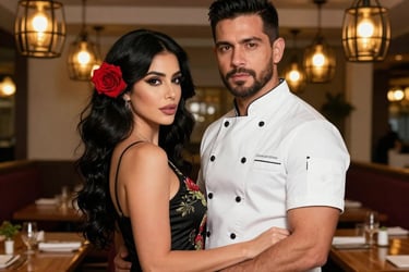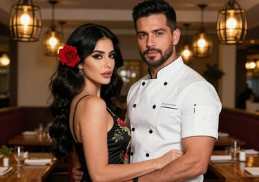 Jose, the chef of La Rosa Negra, confesses his desire to take waitress Maria out, away from the restaurant's chaos, as their shared glance across the dining room ignites a charged moment.