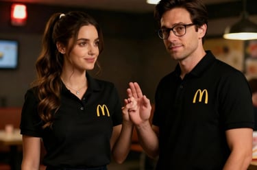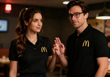 In the quiet of a closed McDonald’s, Cindy and Louie share a charged moment of vulnerability, their unspoken desires sparking under dim emergency lights.