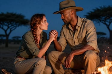 By a dying fire, Marie and Lethabo share a charged moment, their hands brushing as they discuss belief, risk, and the stories the land remembers.