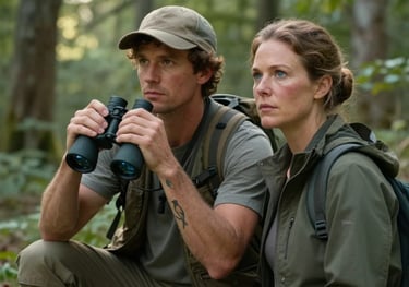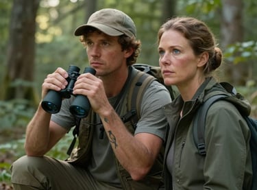 Ronald and Norrine share a charged moment in the arboretum, their birding passion intertwining with unspoken attraction as they discover a rare Cerulean Warbler.