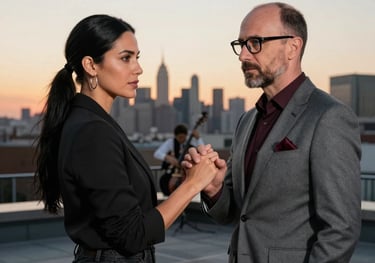 Gina and Elias share a charged dance at a crowded rooftop party, their connection deepening amidst the bustling crowd as they navigate unspoken tension and mutual attraction.