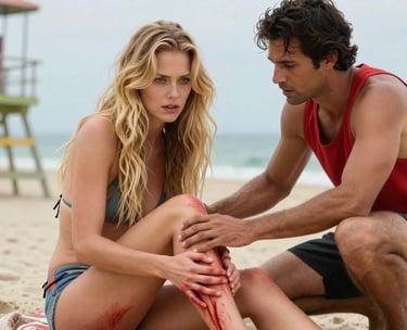 Debbie Mason faces a sudden, painful injury while surfing, forcing lifeguard Raphael to act fast. As he pulls her from the treacherous water, they share a tense, intimate moment amid the threat lurking beneath.