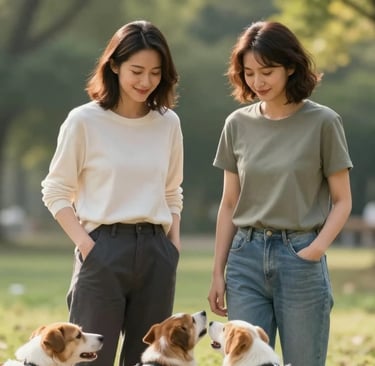 The woman turned, straightening up as she caught sight of Laura and the two dogs. Her hazel eyes- warm, flecked with gold- landed on Laura, and for a second, there was a flicker of something unreadable in her expression. Then she smiled, and it was the kind of smile that made Laura's chest tighten just a little. Easy. Genuine.