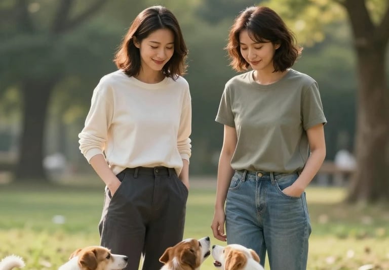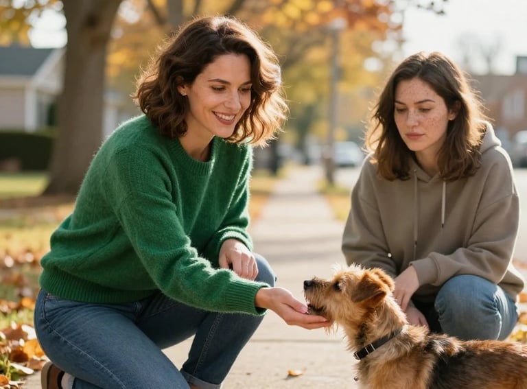 She had just rounded the corner onto Maple Street, a quiet residential block lined with well-kept houses and manicured lawns, when she spotted another dog walker ahead. A woman with short, wavy brown hair stood near the edge of the sidewalk, her back to Laura as she bent slightly to adjust the harness on a large, shaggy dog that looked like a mix of golden retriever and something equally fluffy. The dog's tail thumped against the woman's legs, and Laura could hear the low, affectionate murmur of her voice as she spoke to it.